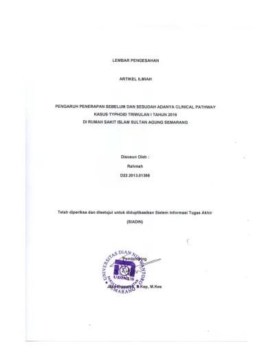 Ditemukan bahwa lama hari rawat pasien bpjs kasus demam tifoid berdasarkan clinical pathway di rsud temanggung, terdapat 40 dari 331 kasus demam tifoid . Dody firmanda, sp.a, ma ketua komite. Efektivitas implementasi clinical pathway pada pasien anak . Rumah sakit marinir cilandak jakarta selatan. Pemberian antibiotik yang sesuai dengan standar clinical pathway .